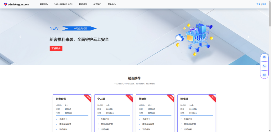 安全保障,有效保障网站、APP 等业务的稳定与安全。 在当前双十一期间特别提供CDN免费套餐(支持接入2个域名、10G流量/月、10Mbps带宽),方便大家在不清楚效果的情况下尝试!